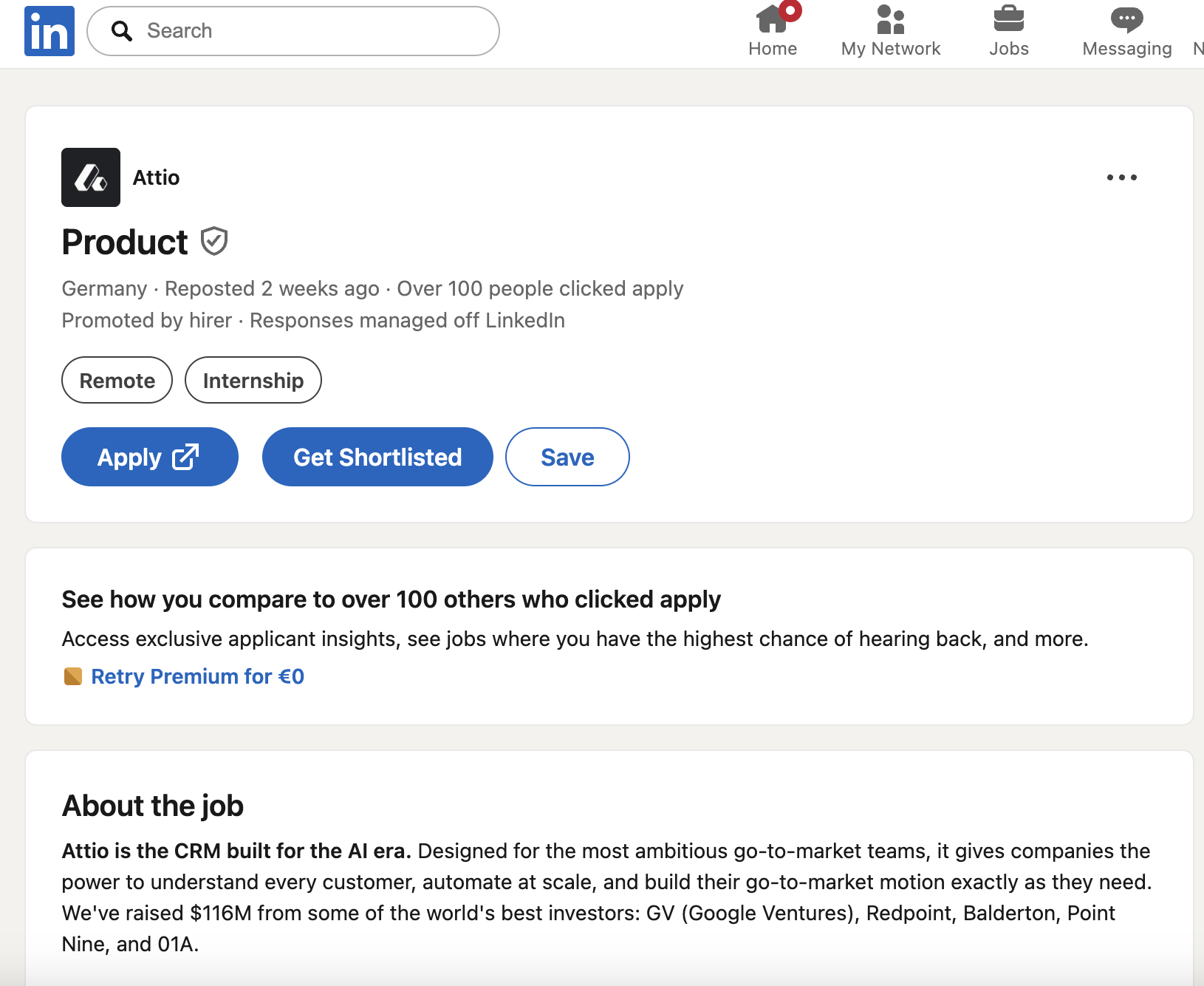 Install the extension. Visit any LinkedIn job page. Next to LinkedIn's Apply or Easy Apply button, you'll see a new pill that reads Get Shortlisted.