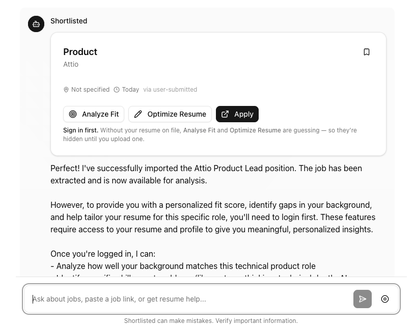 Those five fields are sent to your Shortlisted account the same way they would be if you'd pasted the job description into the chat yourself. From there, every existing tool — fit analysis, resume gap detection, interview, tailored output — runs as it always has. The extension is intentionally thin: it's a launcher, not a separate product.